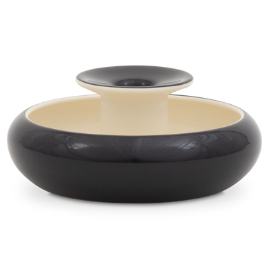 Il candelabro di Hedwig Bollhagen, con il numero di modello «215», ricorda un incrocio tra un disco volante e un fungo capovolto. Caratteristico è il corpo arrotondato e convesso con al centro il candelabro cilindrico a forma di camino, che si allarga verso l’alto a forma di cono fino al portacandela. Con un diametro di 14 centimetri, il candelabro alto sei centimetri è più del doppio più largo che alto. Con un peso di 750 grammi, questo candelabro non solo è uno dei pezzi più pesanti della collezione, ma è anche solido e stabile. E se per caso, con una folata di vento, la cera dovesse gocciolare, il piattino integrato evita fastidiose macchie. Insomma, è bello ciò che funziona.