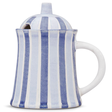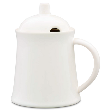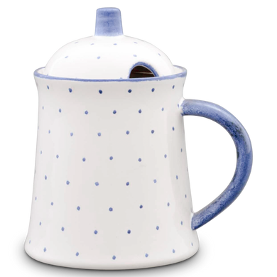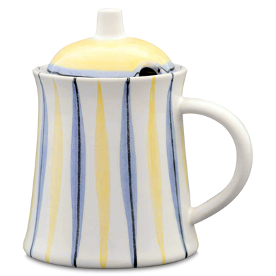 Il vaso con il numero di modello “565” di Hedwig Bollhagen è noto tra i dipendenti della manifattura ceramica di Marwitz anche come vasetto per il miele. Ne sono caratteristiche il corpo leggermente conico e il manico semicircolare decorato. Il coperchio bombato verso l’alto a forma di sfera, con la maniglia a forma di stilo, completa armoniosamente il design. Grazie all’apertura semicircolare di circa un centimetro sul bordo del coperchio, il cucchiaio da miele trova la sua collocazione senza scivolare. Con una larghezza di otto e un’altezza di undici centimetri, il barattolo è alto quasi quanto è largo. Con la sua capacità di 0,15 litri, riesce a presentare in modo elegante, pratico e sostenibile una quantità sufficiente di miele di acacia, di bosco o di castagno.