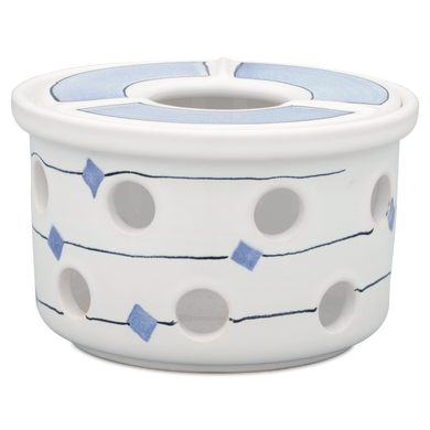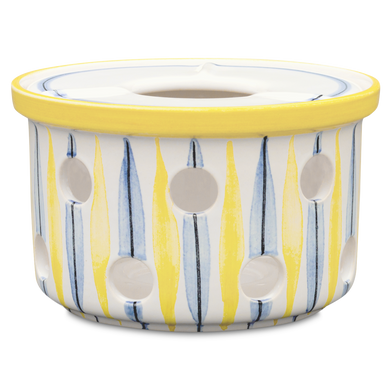 Il portacandela a due pezzi di Hedwig Bollhagen, con il numero di modello «535», crea un'atmosfera accogliente e rilassante. Caratteristici sono la forma lineare e cilindrica del corpo e il sottopentola piatto appoggiato sopra con l'apertura rotonda per la candela al centro. E grazie ai numerosi fori di aerazione di circa un centimetro, l'illuminazione discreta accende sicuramente più di una luce. Con un peso di 350 grammi e un'altezza di sette centimetri e mezzo, questo bruciatore ha un diametro di dodici centimetri ed è più largo che alto. Che si tratti della terrina con il brodo chiaro, del caffè del buongiorno sul tavolo della colazione o della teiera sulla scrivania, con i bruciatori in ceramica di Hedwig Bollhagen le zuppe fredde e le bevande calde appartengono finalmente al passato.